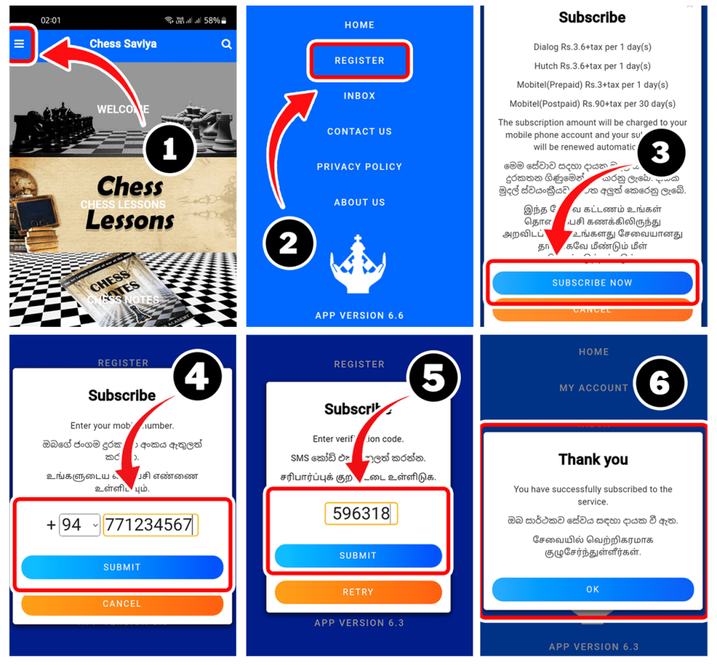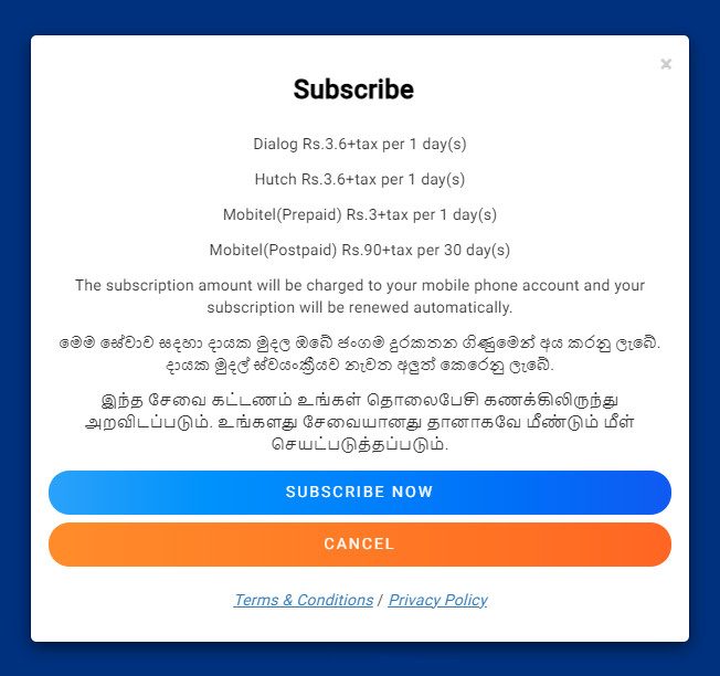 - ඉන්පසු දිස්වන මෙනුවේ ඇති “Subscribe Now” (3) ක්ලික් කොට ඔබගේ Dialog, Hutch හෝ Mobitel දුරකථන අංකයේ 0 ඉවත් කොට පහත සඳහන් පරිදි ඇතුළත් කරන්න. (4)