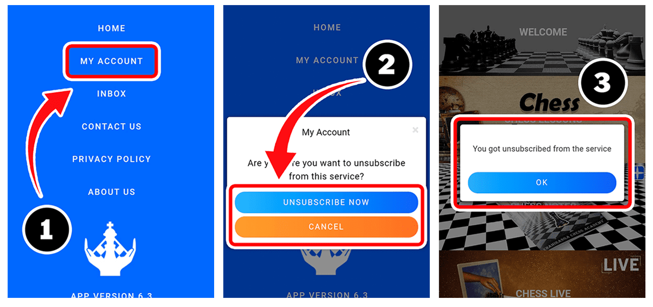- ඔබට චෙස් සවිය සේවාවෙන් ඉවත් වීමට අවශ්ය නම් ඇප් එකේ Account වෙත ගොස් පහසුවෙන්ම Unsubscribe කිරීමේ හැකියාව පවතී.